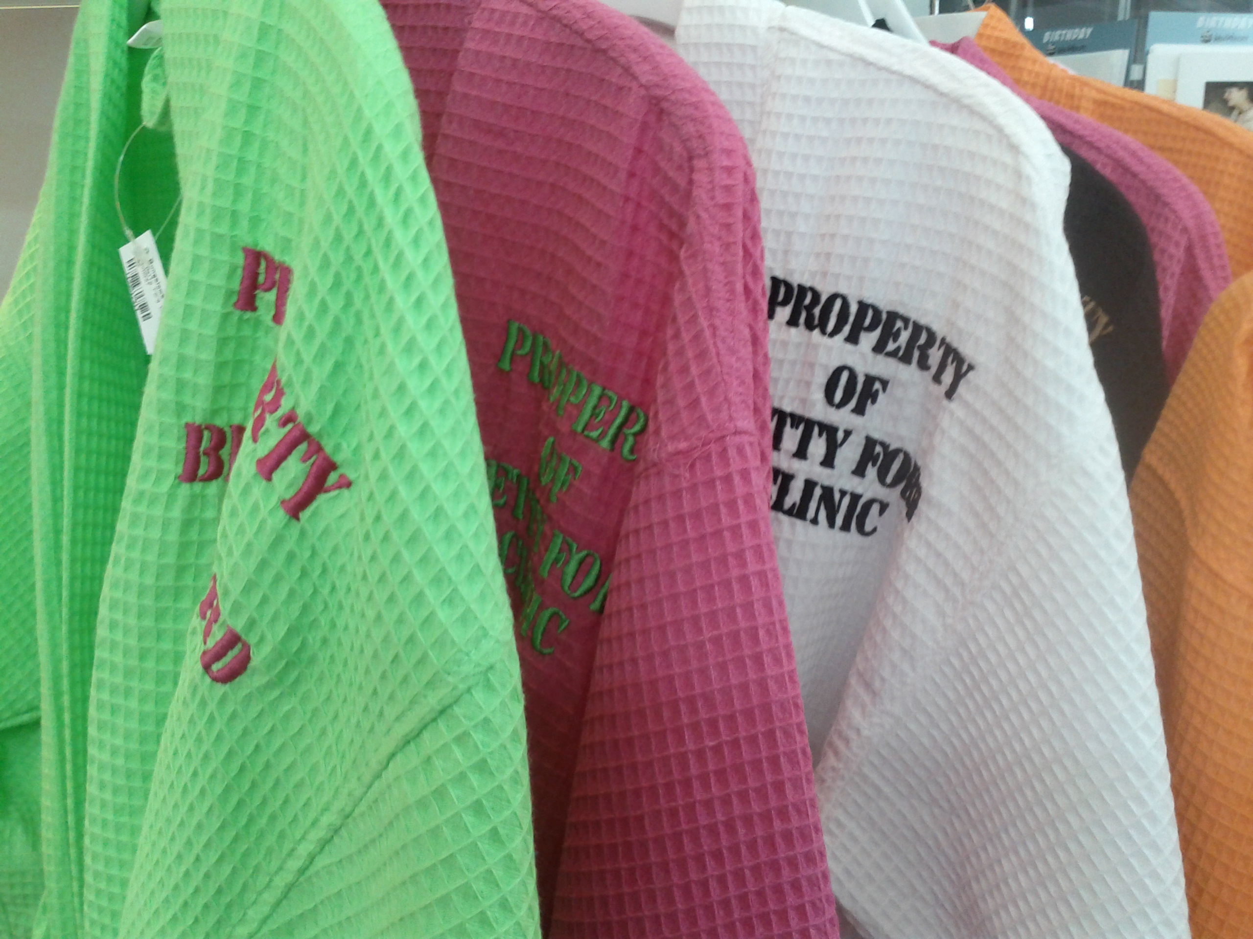 What really got my attention was the window with the funny but very practical & colourful waffle robes monogrammed with “property of the Betty Ford clinic.”