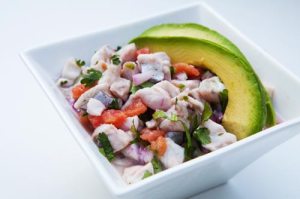 Halibut with jalapeño, tomatoes, cilantro & lime juice. Served with sliced avocados, olives, capers & red onion on the side.