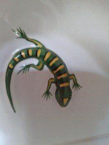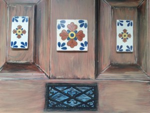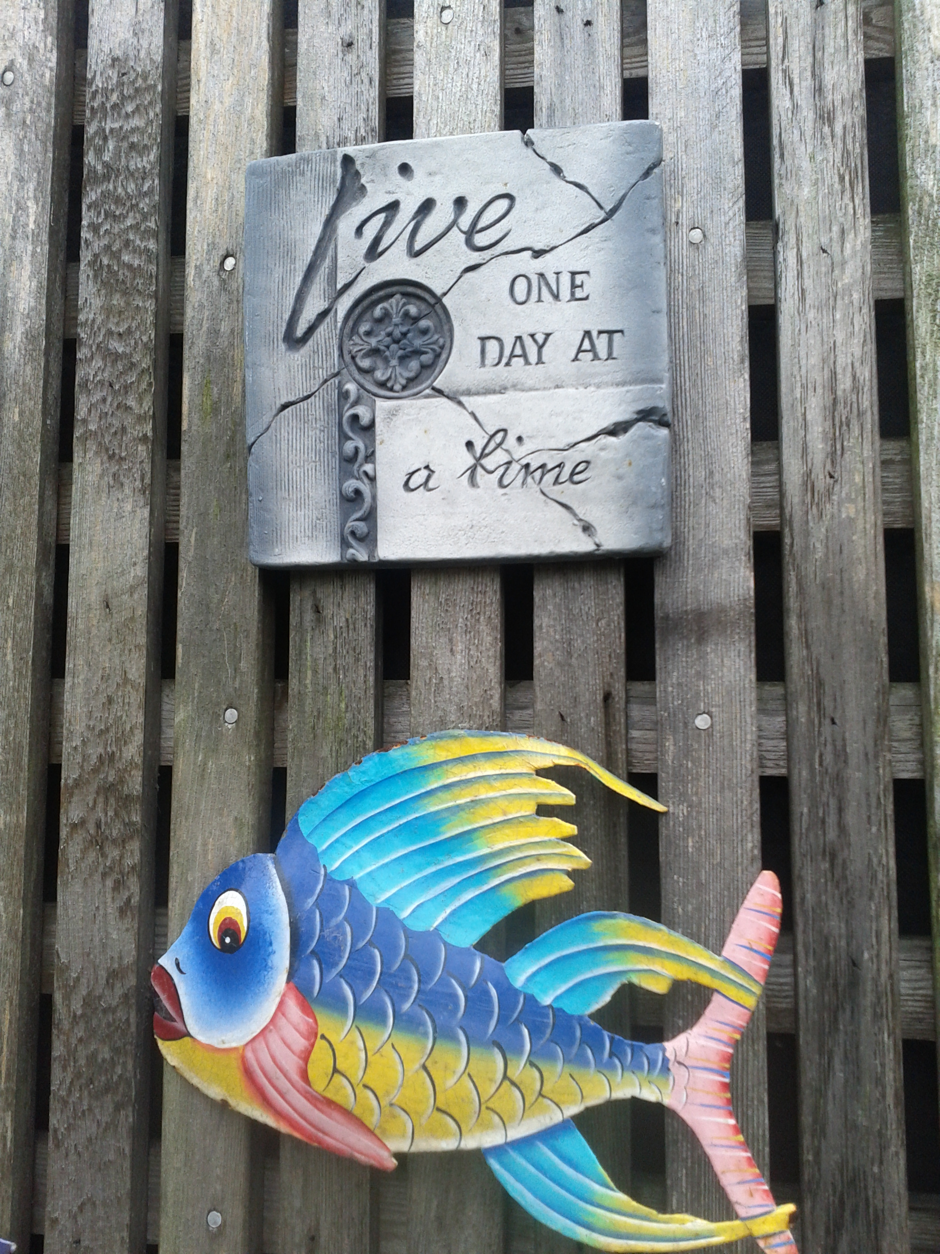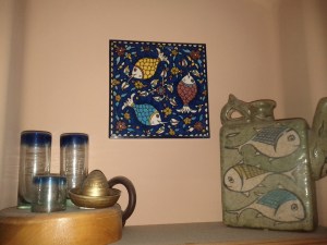 To decorate a doorFrom Jamaica – ackee is the national fruit of Jamaica – over stove top cooking elementsPetroglyph from trip to UtahItalian tiles up staircaseTile on upper deck bought at Home SenseFramed Mexican tile on upper deckLive one day at a time – outsidePretty & Useful – on tumbled Italian marble kitchen countertop.