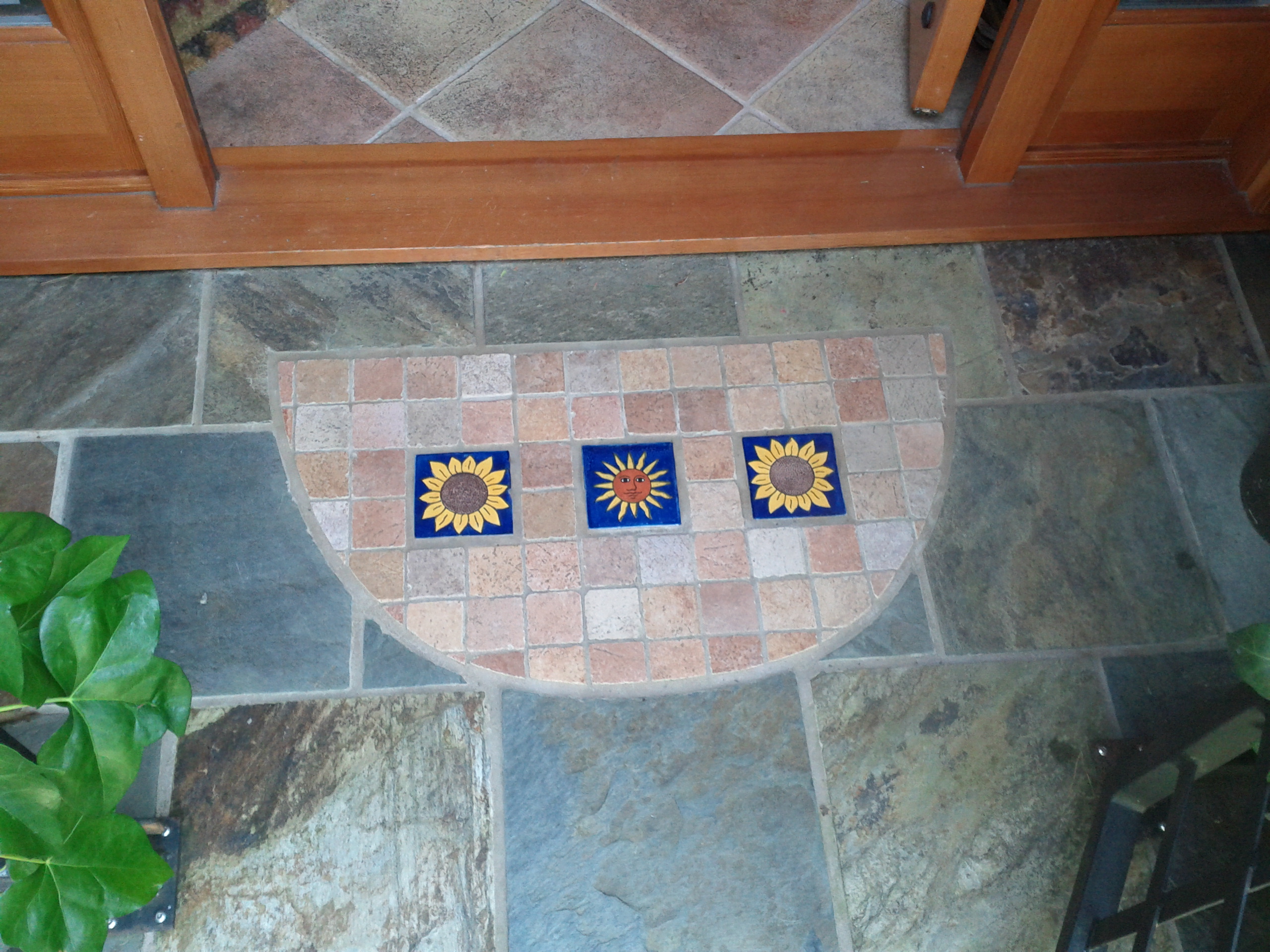 Mexican tiles imbedded outside front door to resemble a decorative door mat