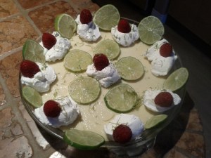 Top with meringue (made with the leftover egg whites) while filling is hot or with whipped cream when cold. Top either with grated lime zest and decorate with sliced limes and some fruit for appearance sake.