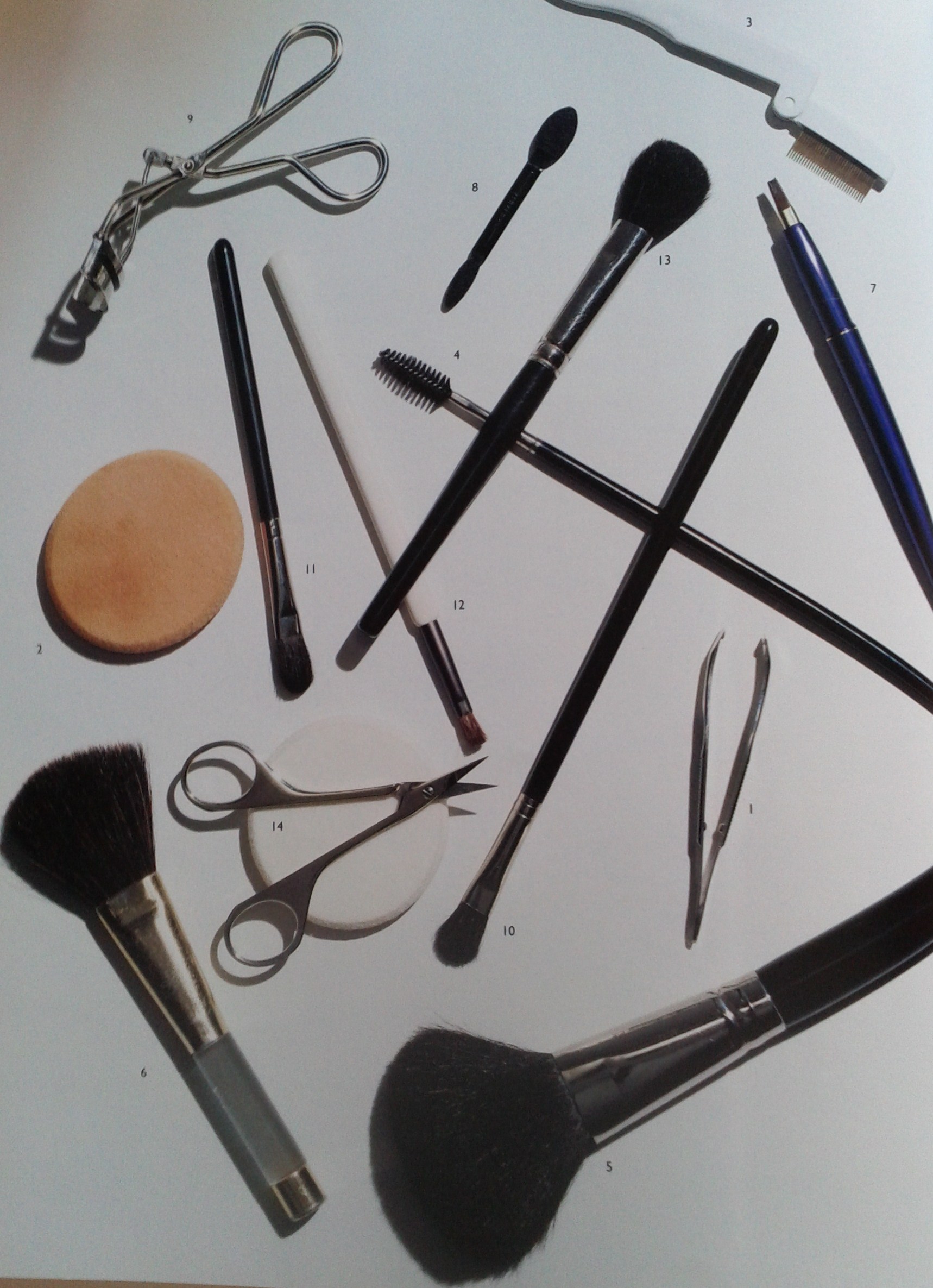 10/11/12: Eye Shadow Brushes– different kinds for applying eye makeup to lids and browbone. Slanted is great for dipping into powder when slightly damp for eyeliner.