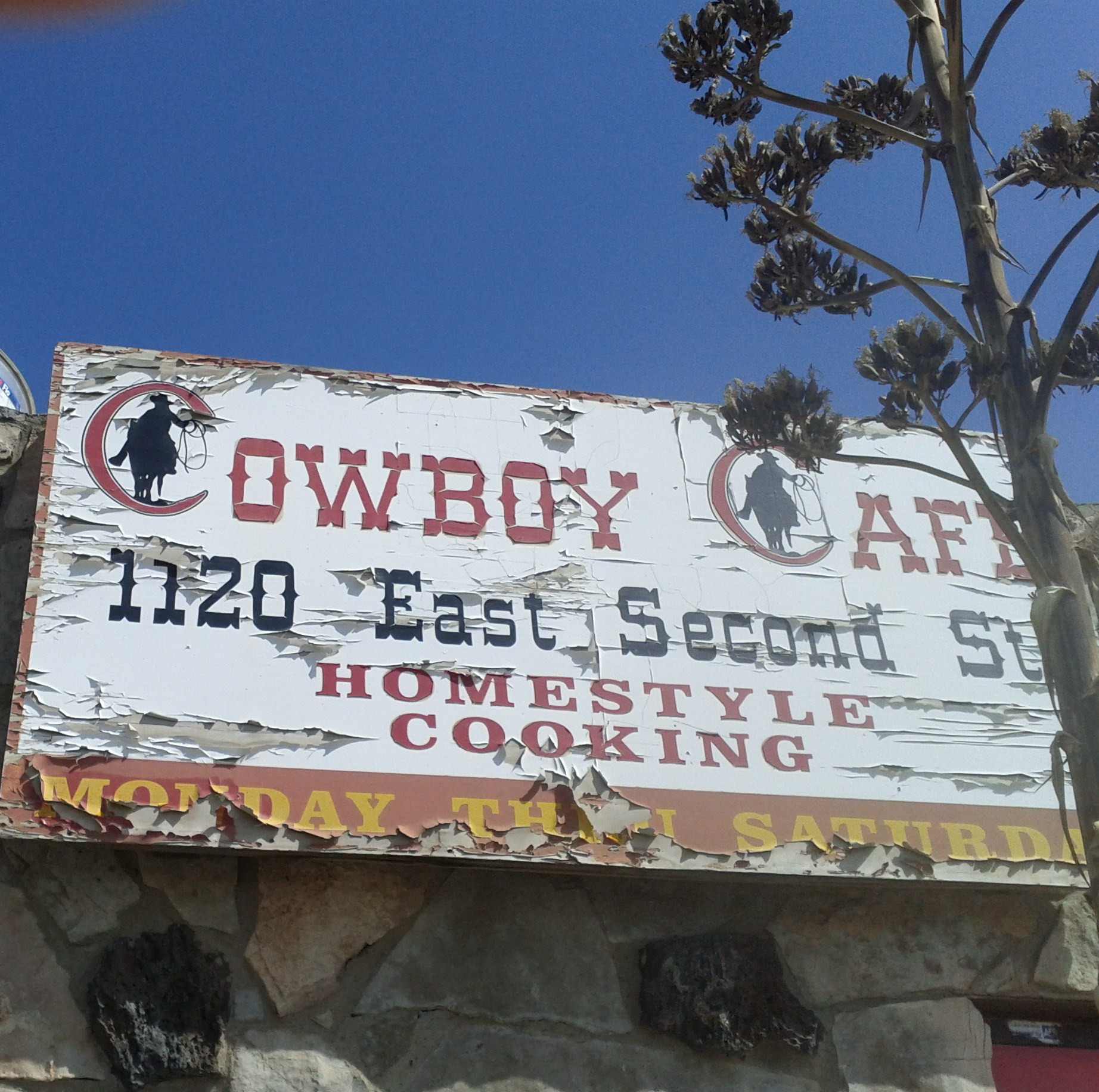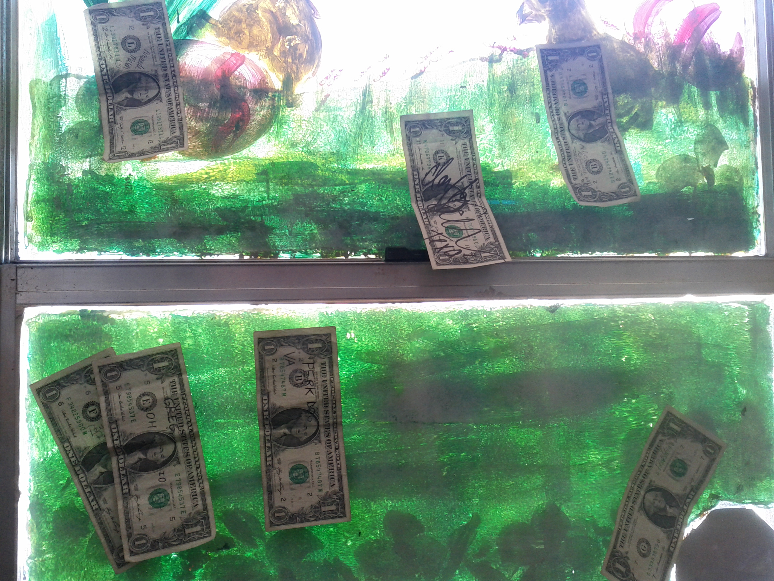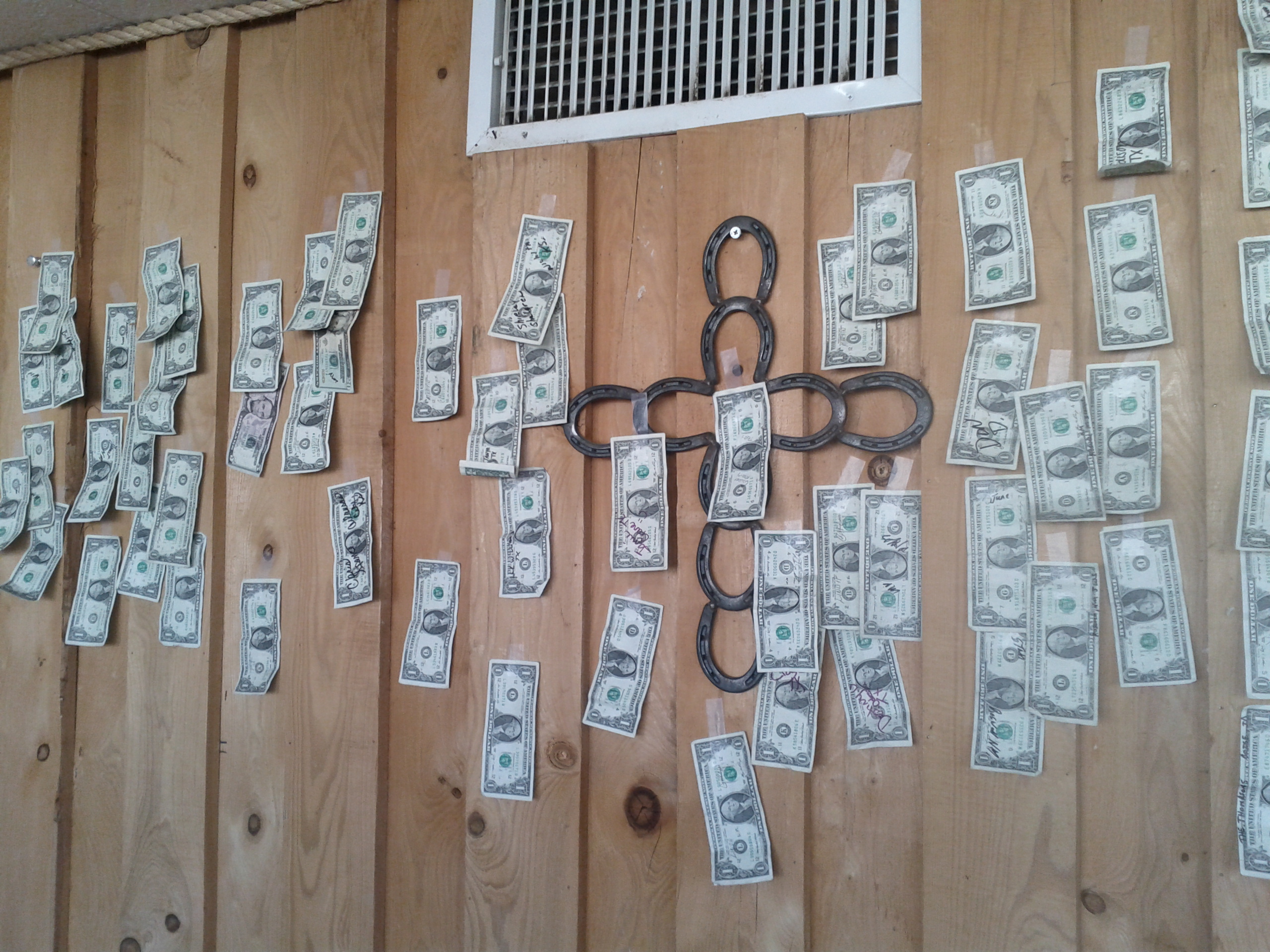 At Cowboy Cafe in Roswell where customers write their names and state on $1 bills and stick them all over the restaurant walls, windows, ceilings….wherever they can just for fun.