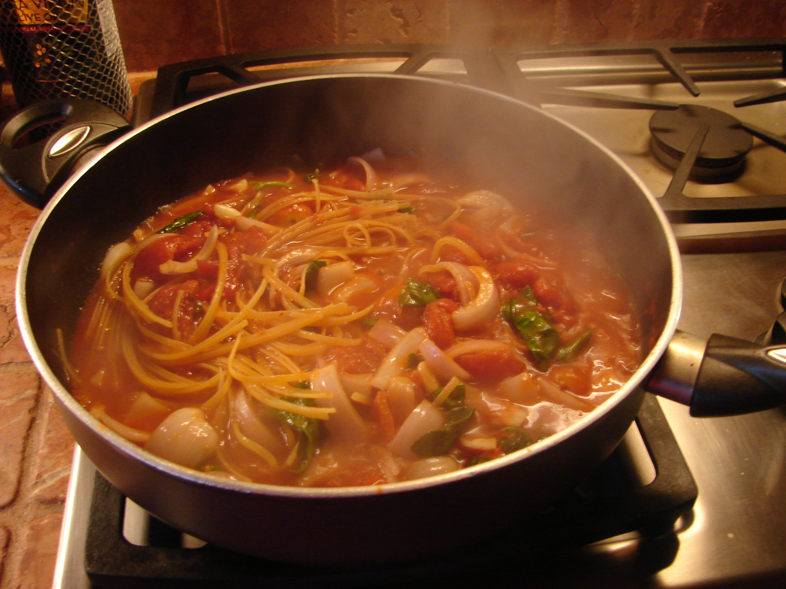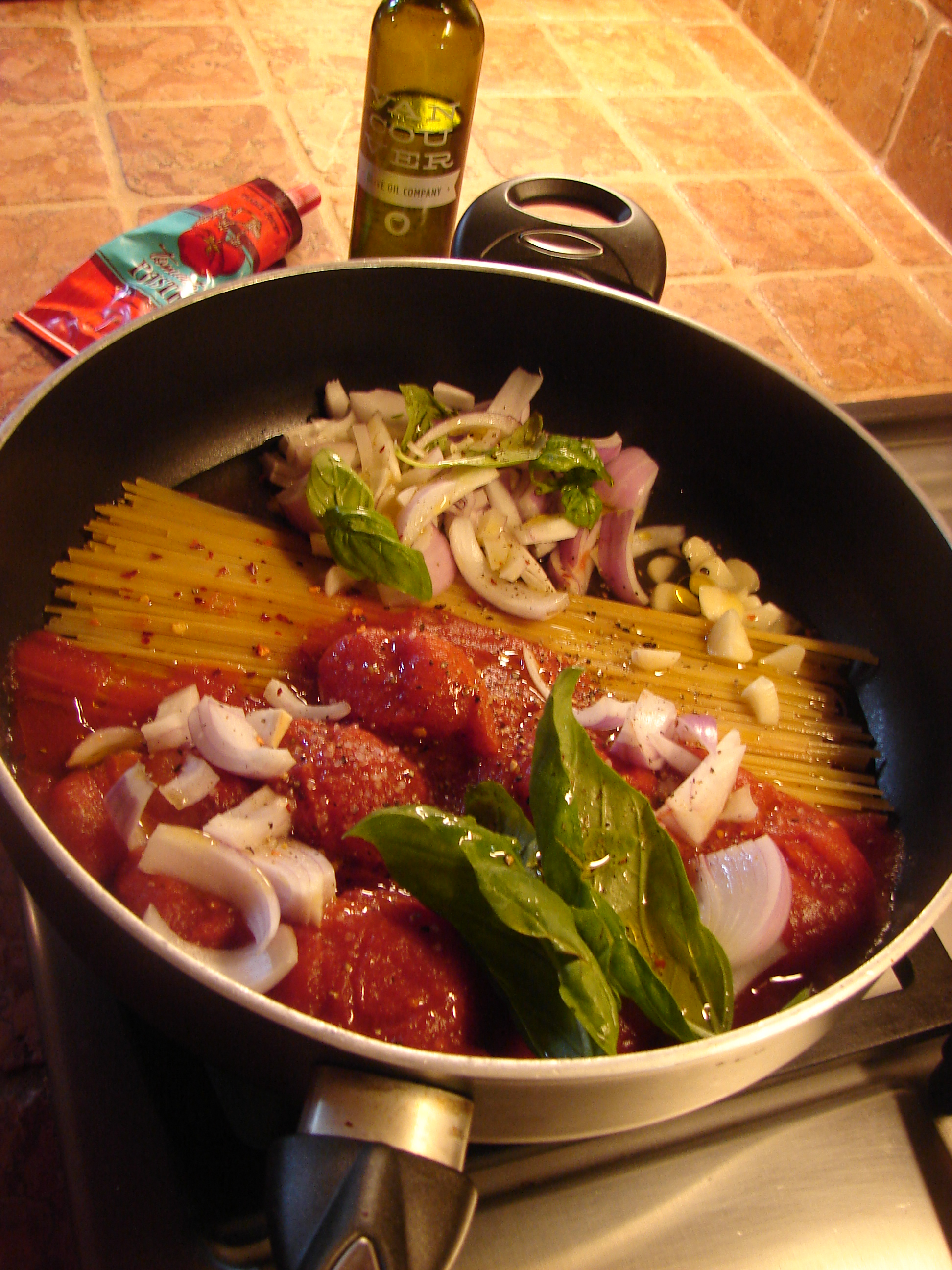 There’s a tiny restaurant in the Puglia region of Italy where the chef places dried pasta in a skillet with water, tomatoes, onion, garlic, herbs and a glug of extra virgin olive oil.