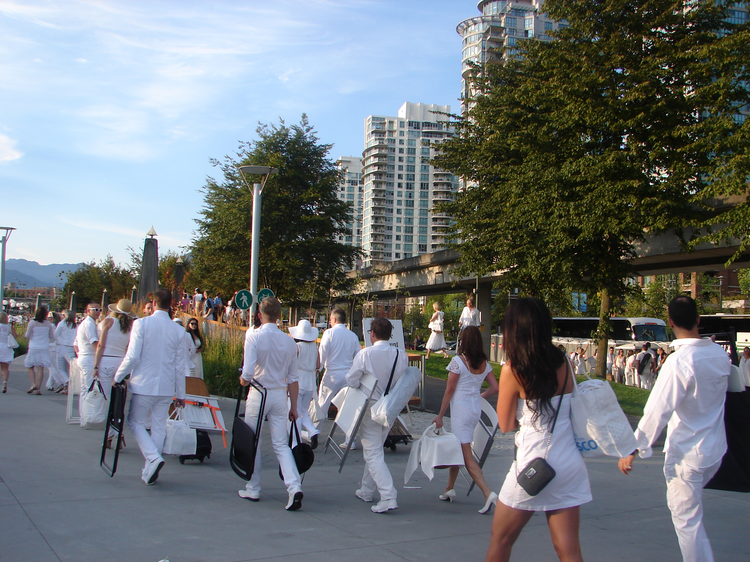 This exclusive sold out evening drew 2,500 people, double the size of the first Vancouver one held last year near the Olympic cauldron at Jack Poole Place. What a coincidence that Black Sabbath happened to be playing at Rogers Arena on the same night. Which left many black clad fans on their way to the concert wondering what the hell was going on and why everyone was dressed up all in white – a strict dress code requirement. Not only that, but participants were required to bring their own picnic baskets, folding tables, chairs, dinnerware and even food unless you arranged to have it catered. You had to make arrangements to order wine & champagne ahead of time too.