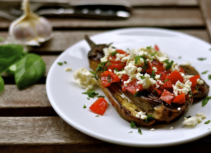 Grilled Eggplant (or aubergine as it is called in France) with Tomatoes, Basil & Feta.