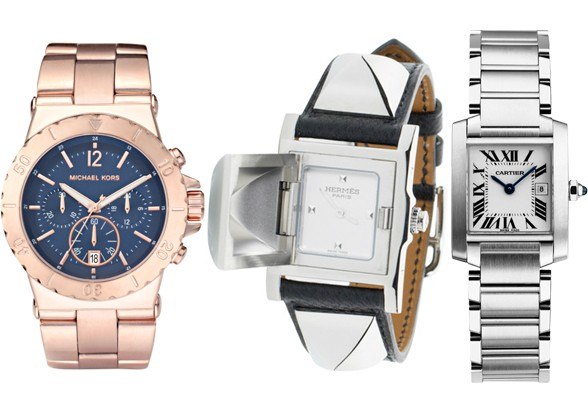 from left: chronograph watch in rose gold/navy, $275, michaelkors.com; medor, $4,050, hermes.com; tank française watch, medium model, $4,700, cartier.us