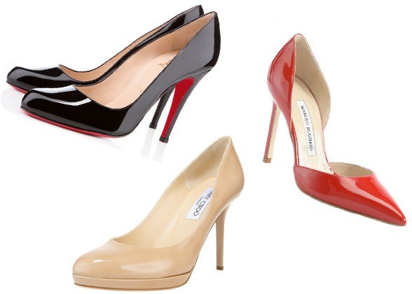 from left: decollete 868 100 mm, $625, christianlouboutin.com; aimee patent platform pump, $675, jimmy choo, bergdorfgoodman.com; tayler patent leather d’orsay pumps, $735, manolo blahnik, saksfifthavenue.com