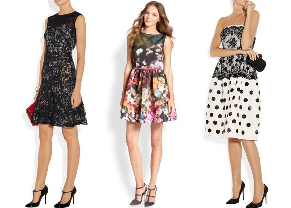 from left: ruby printed silk crepe de chine and cotton-blend lace dress, $3,220, erdem, net-a-porter.com; garden-print dress, $895, red valentino, saksfifthavenue.com; embellished lace and silk-faille dress, $6,990, oscar de la renta, net-a-porter.com