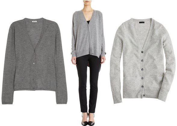 from left: cashmere and silk-blend cardigan, $640, miu miu, net-a-porter.com; asymmetric hem cardigan, $595, alexander wang, barneys.com; collection cashmere boyfriend cardigan, $238, jcrew.com