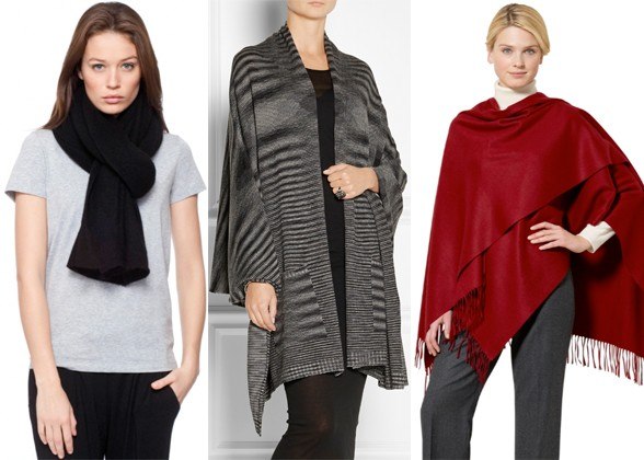 from left: cashmere travel wrap, $295, whiteandwarren.com; striped wool-blend wrap, $600, missoni, net-a-porter.com; cashmere ruana, $498, brooksbrothers.com