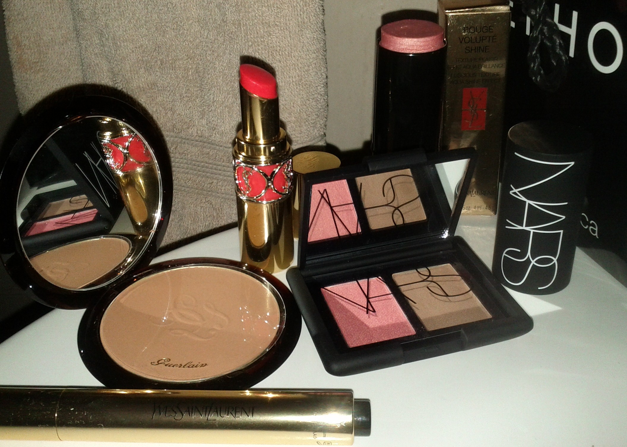 Stuff I needed: Sephora instant nail polish remover. Other stuff I wanted needed: Guerlain Terracotta Bronzing Powder, Nars (the multiple stick) in Orgasm, YSL Rouge–Volupté – silky sensual radiant lipstick (SPF 15), YSL Touche–Éclat pen, Nars blush/bronzer duo (in Orgasm & Laguna) for purse & travel convenience.