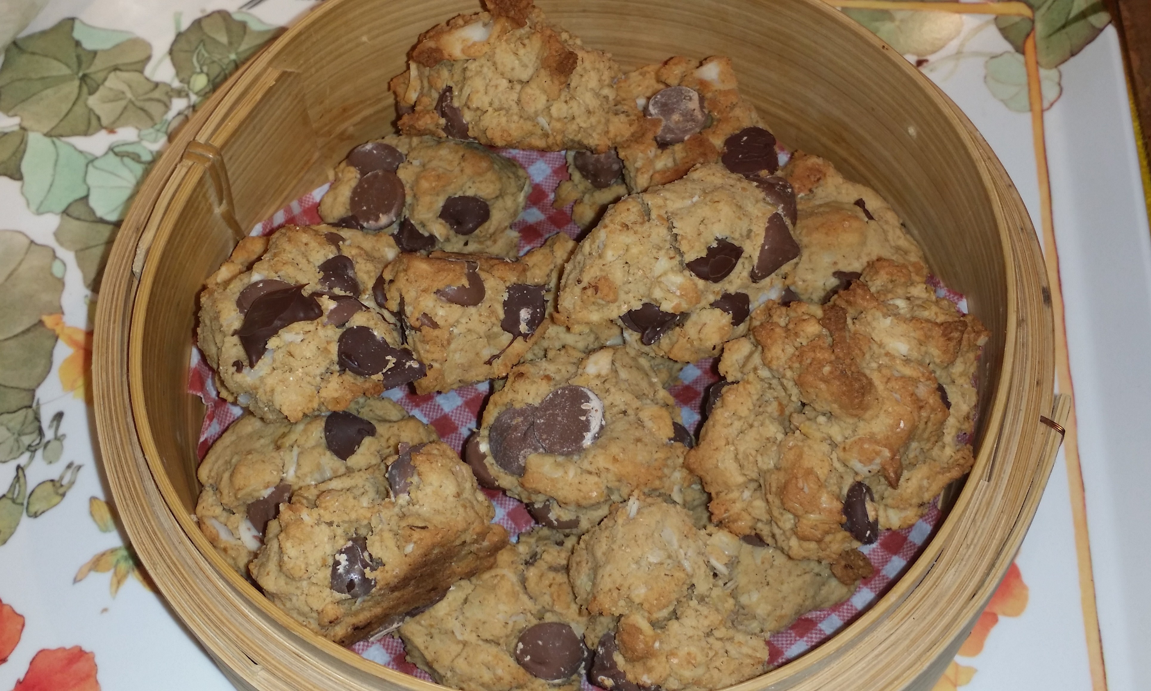 In a medium bowl, whisk together brown sugar, oil, almond milk, vanilla (or combo of vanilla & almond extract); pour mixture into the batter and stir until combined. Stir in chocolate chips and coconut flakes.