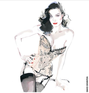 For instance, The above image was used on the front cover of Cally Blackman’s best-selling book, 100 Years of FashionIllustration. The crystals shimmer in the night light and as if accident would have it, Downton lands one single circle of red paint precisely where the model’s nipple is hidden.