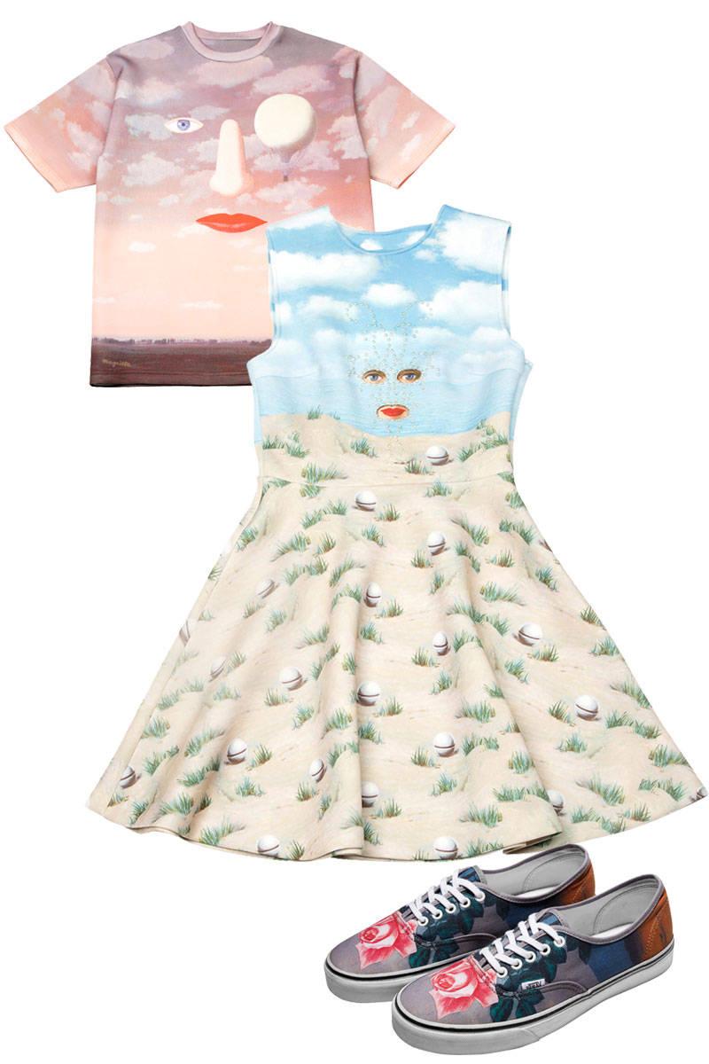 Humberto Leon and Carol Lim had their heads in the clouds for their new collaboration with the Magritte Foundation. The duo’s favorite paintings by the surrealist adorn clothing of their own design, as well as shoes by Vans, Birkenstock, and Manolo Blanik.