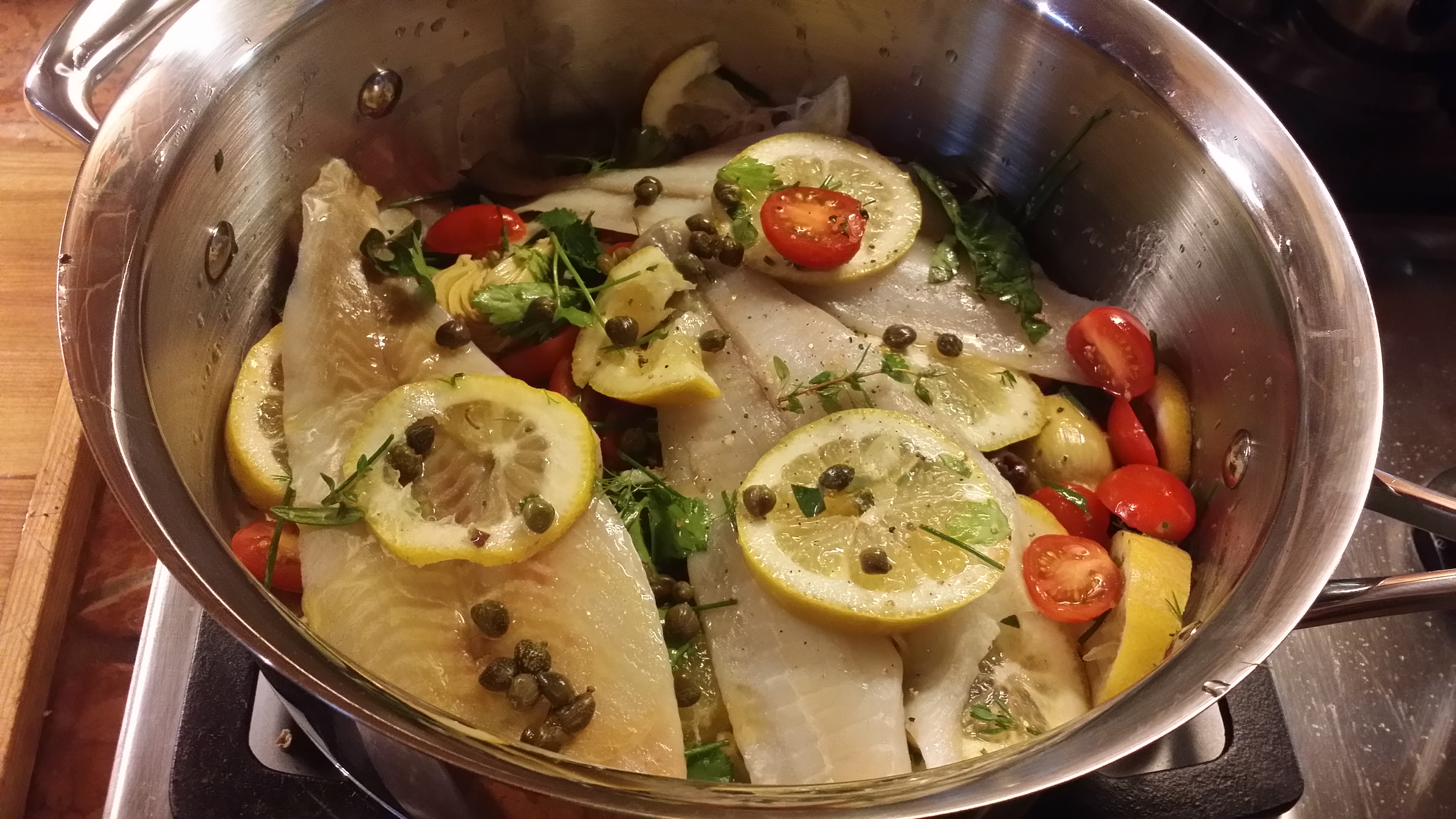 Pour in some white wine and olive oil. Put the pan on grill, cover the grill, and cook just until the juices bubble and the fish is cooked through (roughly ten minutes or so).