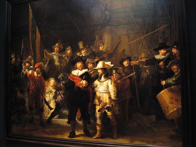 8. Completed in 1642, at the peak of the Dutch Golden Age, The Night Watch is one of the most famous paintings by Dutch painter Rembrandt van Rijn. It depicts a city guard moving out, led by Captain Frans Banning Cocq and his lieutenant, Willem van Ruytenburch. For much of its existence, the painting was coated with a dark varnish which gave the incorrect impression that it depicted a night scene, leading to the name Night Watch. This varnish was removed only in the 1940s. The painting is on display in the Rijksmuseum in Amsterdam.