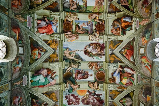 4. The Sistine Chapel ceiling, painted by Michelangelo between 1508 and 1512, at the commission of Pope Julius II, is one of the most renowned artworks of the High Renaissance. The ceiling is that of the large Chapel built within the Vatican in Rome. Central to the ceiling decoration are nine scenes from the Book of Genesis. Among the last to be completed was the Creation of Adam in which God the Father breathes life into Adam, the first man. The Creation of Adam is one of the famous paintings of all time and has been the subject of countless references and parodies.