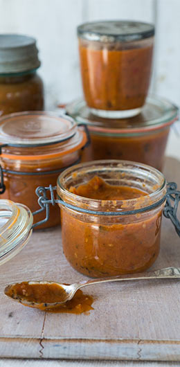 Pour the sauce into the prepared sterilized jars leaving a ¼” space and screw the lids on. Tap the jars on the counter top to get rid of air pockets and wipe clean with a damp cloth. Place in the oven for 30 minutes to seal.