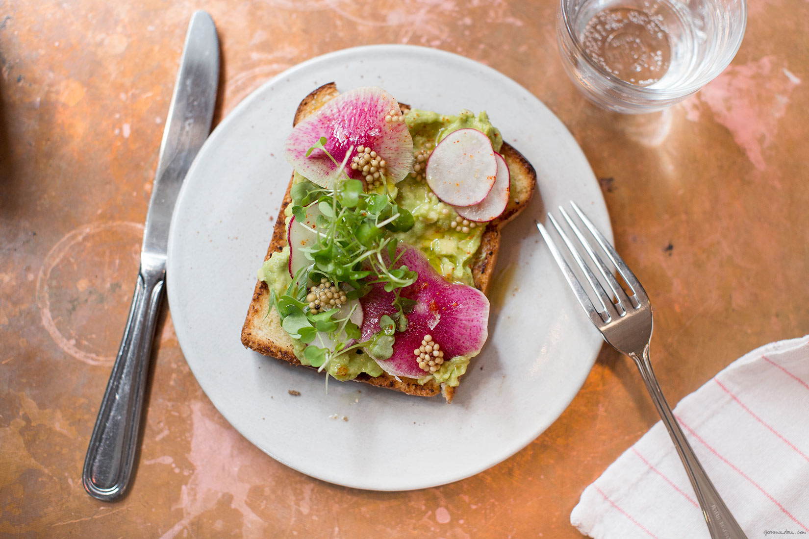 3. Toast bread and layer with avocado mash, followed by radish, scallion, herbs, and mustard seed.