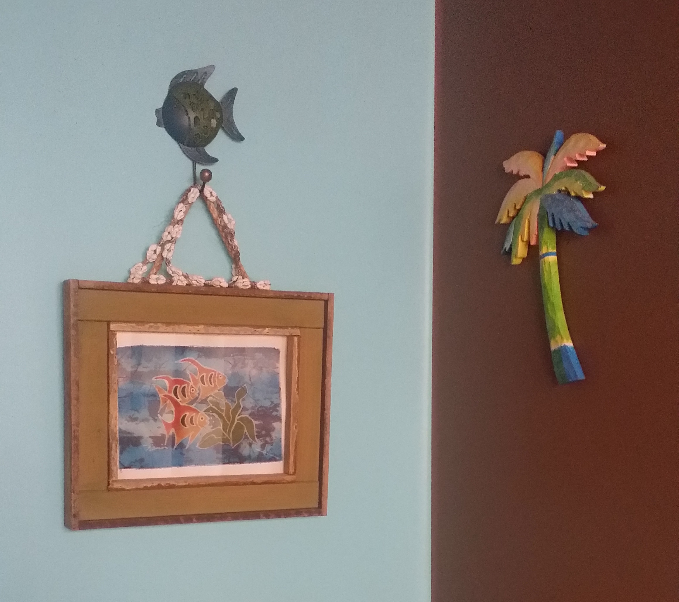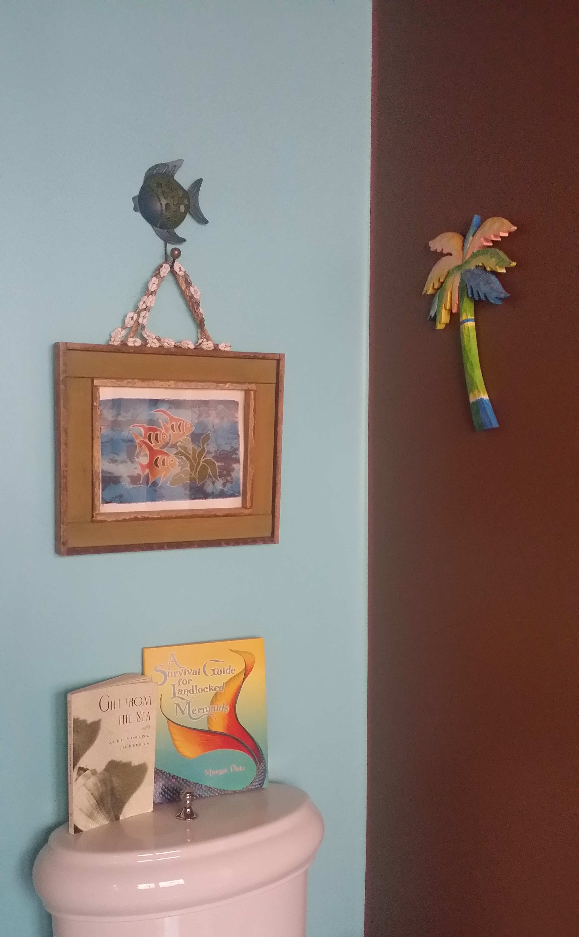 This year I had my bathroom painted a colour I would have never considered before. Chocolate Brown. I had a few samples narrowed down and for fun asked my dog to make the final decision. He actually put his paws on one of the samples, so I chose that one. When I turned the sample around it was named “Dog Paw.” This is no word of a lie – I swear! Can you believe there is even a colour with a name like that? Neither could I. But maybe they’re referring to dirty dog paws and the tracks they leave on your floor. Well that makes sense. Then I had a wall painted a tropical blue as an accent colour – just to remind me of being in the Carribbean. Thought it might be a bit too much but it could always be changed…. ended up loving it. It’s bright and cheery. Bill the handyman really did an excellent job. He can do anything. I’m going to write a post soon on the people we need in our lives – a handyman is one of them! TRUE!