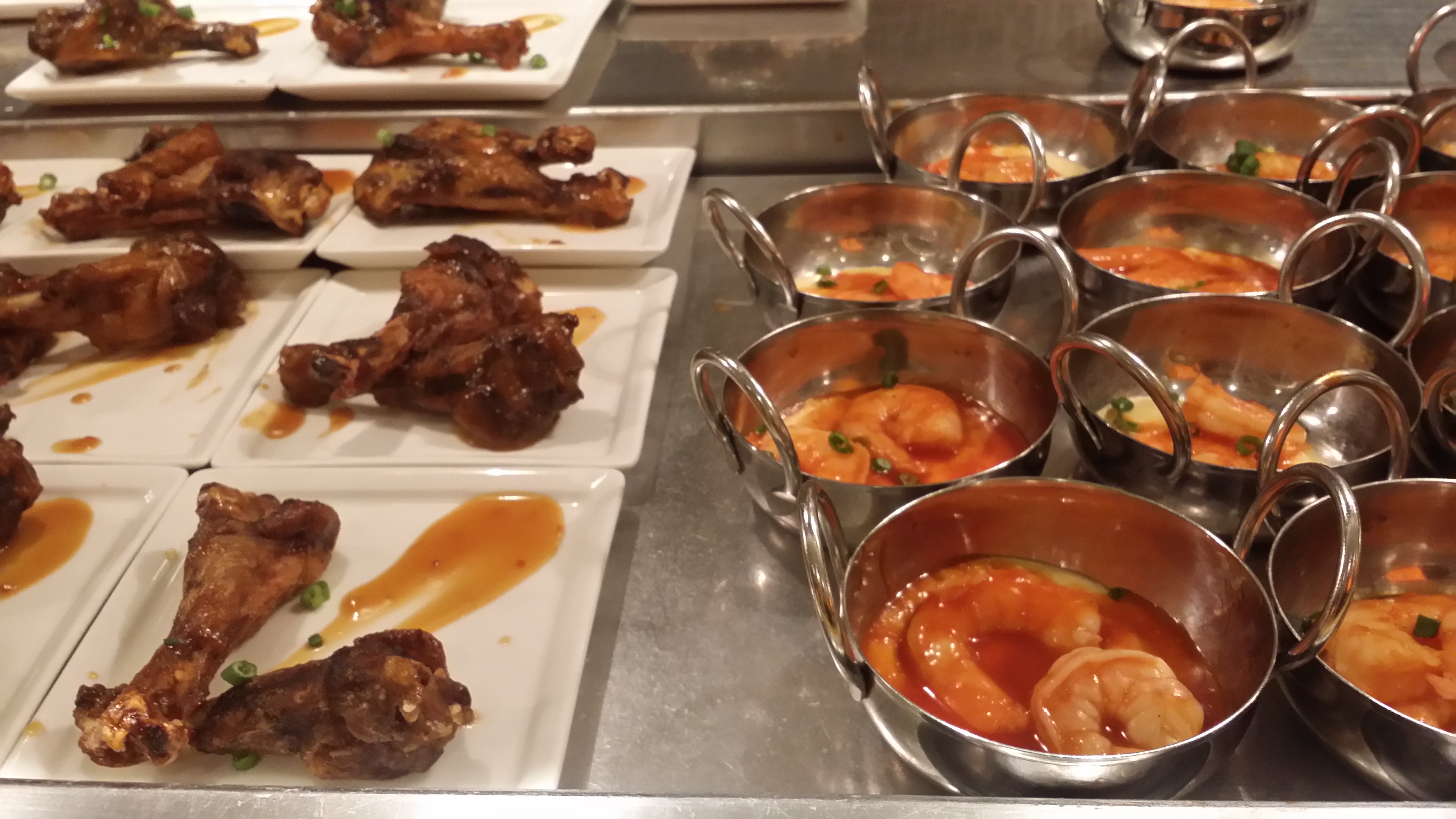Much like any buffet, the Wicked Spoon is divided into sections, beginning with a salad area. But don’t expect the traditional bowl of lettuce with dressings and toppings, though. Instead you’ll find items like Italian panzanella bread salad, chickpea salad, hummus and pita slices and a nice selection of cheeses. There’s a traditional carving station, serving things you’d expect like prime rib and pork, but you’ll also find out-of-the-ordinary items like roasted bone marrow, turkey wellington, meaty beef ribs, lamb and bouillabaisse which included giant gulf shrimp. Sidenote: the Southern fried chicken served in their little individual frying cages was delish.