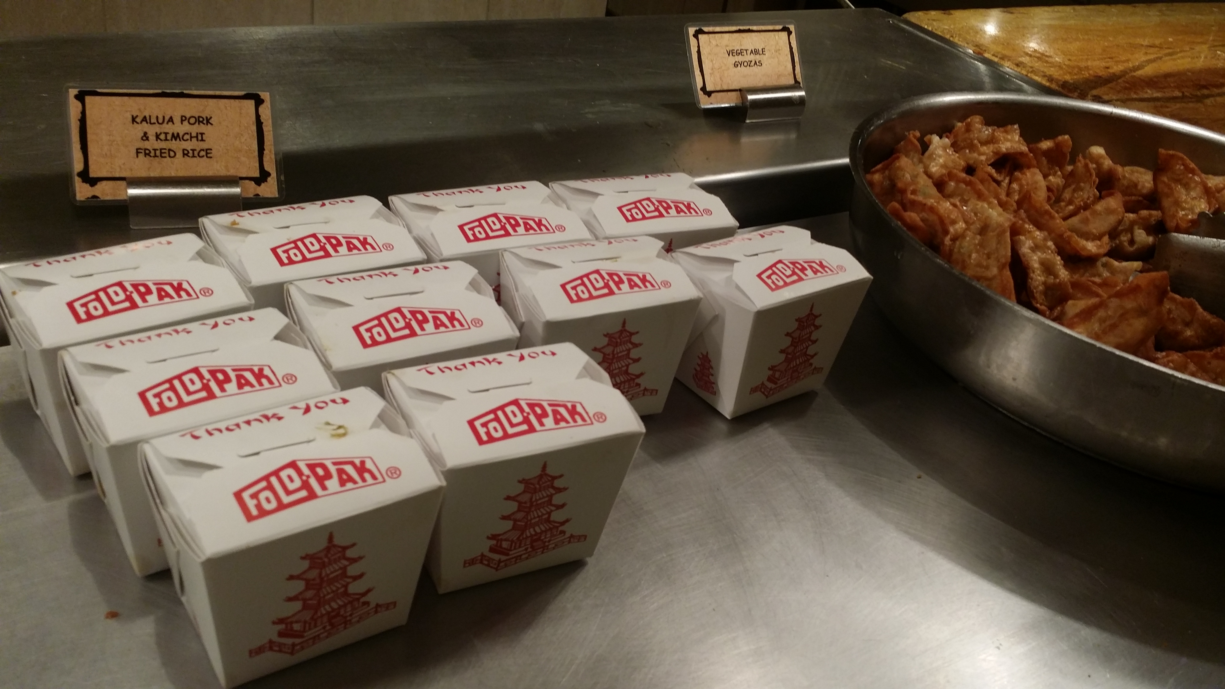 The last station is an Asian food bar that offers items like orange chicken, Korean barbecued ribs in kimchi, sushi and cute tiny Chinese takeout containers filled with just the right amount of rice or noodles.