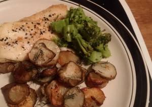 Orange roughy with asian marinade, steamed broccoli & baked sunchokes. Image: d. king