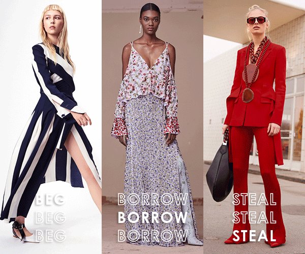 Editors called out their favorite looks: the items they’d beg for because they need them right now, like the bold striped outfit from Monse; the dreamy, not-so-practical looks they’d like to borrow, like Altuzarra’s romantic head-to-toe floral; and the looks they’d like to steal because they feel totally new, like Givenchy’s monochromatic ruby pantsuit (with a huge agate pendant). I wonder how many women can wear these outfits as effortlessly as these models?