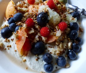 Then place in bowl, mix fresh berries over top (raspberries, blueberries + blackberries are best), chopped walnuts and/or brazil nuts (brazil nuts contain selenium), a little cinnamon and a bit of organic raw honey if you feel you need to sweeten it slightly.