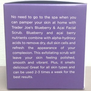 Here’s what it says on the Trader Joe’s website: “While this Scrub is exfoliating, save for a few stray blueberry seeds and its very slight general graininess, it’s not really its texture that does the exfoliating—it’s the alpha-hydroxy acids, or AHAs. We also include colloidal oatmeal, shea butter, meadowfoam seed oil, and various plant extracts to soothe and pamper that beautiful mug of yours.”
