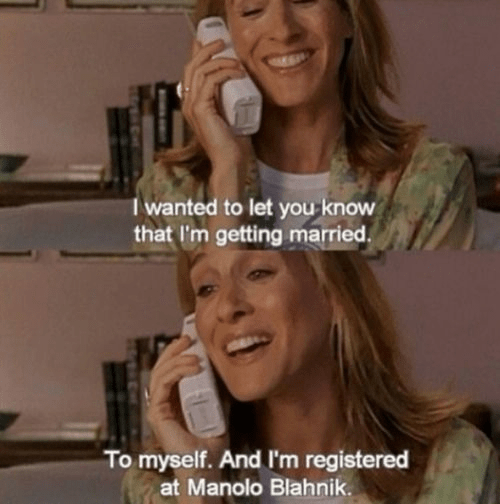 But aside from Dennis Rodman who I’m sure is extremely happy, I found out that a woman named Linda Baker was apparently the first person to marry herself in the US back in 1993 as a celebration of her 40th birthday. And then I remembered the episode of Sex and the City when Carrie Bradshaw gave herself a wedding shower for one. Apparently Sologamy, the act of marrying yourself, is on the rise across the globe. ???