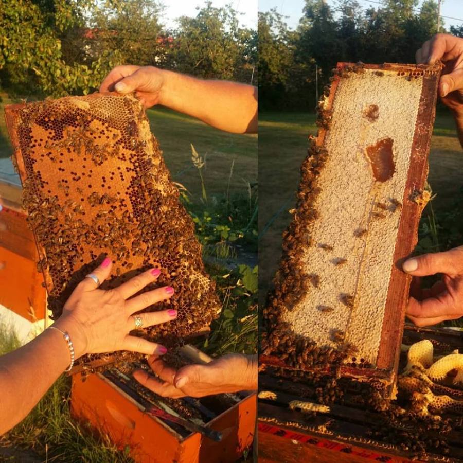 Hand on left belongs to Tamara. Hand on right belongs to Bill. If you don’t freak out they won’t even bother you. The bees I’m talking about.