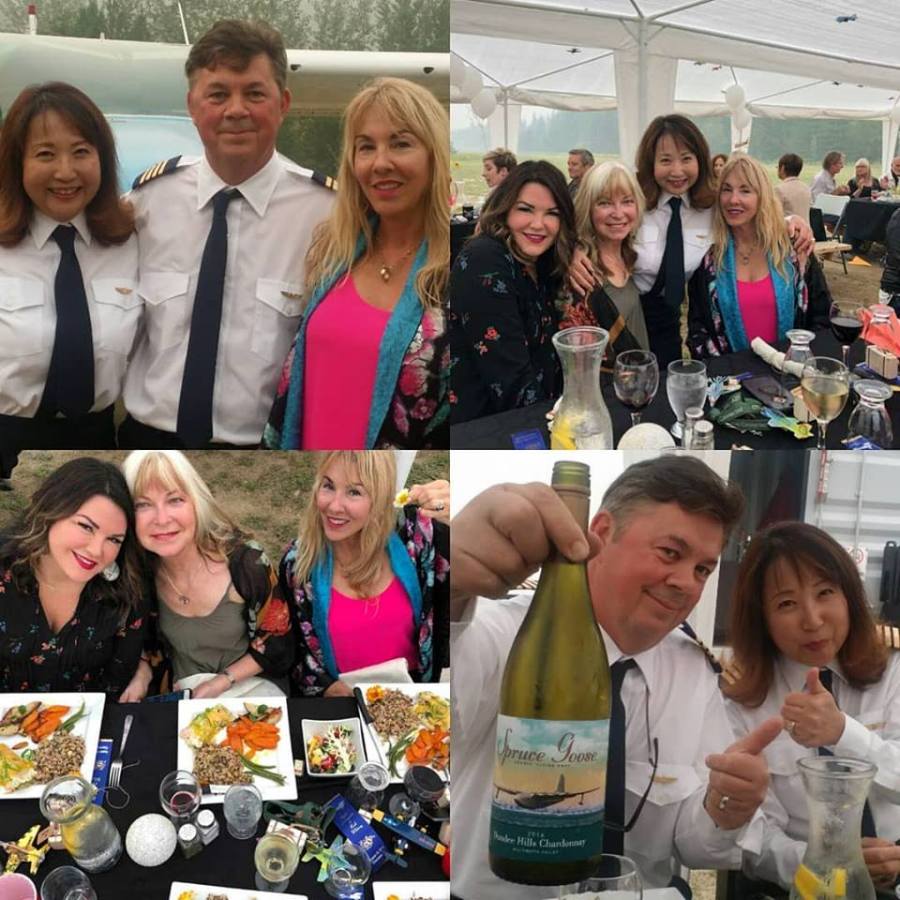 Top L: Riyo (first officer), Rock (captain) + me (flight attendant wannabe). Top R: Lisa, Margeaux, Riyo, me. Bottom L: Lisa, Margeaux, me. BottomR: Rock, Riyo + Spruce Goose Chardonnay.