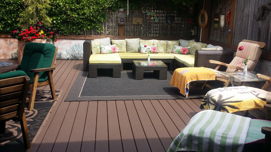 My deck AFTER. The large planter used to be right smack in the middle. A large barbeque and outdoor fridge sit in two corners (not shown).BEFORE the wood was narrower, lighter and on an angle.