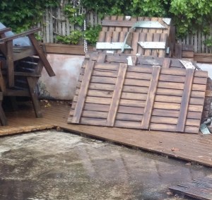 For the downstairs courtyard which has French doors opening up to the outside from the main living area, I considered a clean-up only. A sanding and staining. That was until one of the contractors stepped onto the middle of the courtyard and his shoe went right through the wood. He didn’t intend to make a hole but let’s just say it didn’t look good after that.