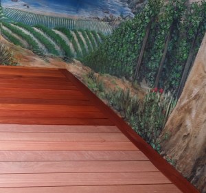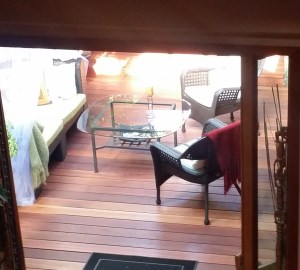 The rich reddish-brown hue is a durable hardwood that is often compared to teak but less expensive. My concern is that it be resistant to shrinkage, splintering, extreme weather conditions, decay, mold and insect attacks (you know; should that ever happen). Better to be safe than sorry. It is. I’m very happy with the whole aesthetic of both the upper and lower spaces.