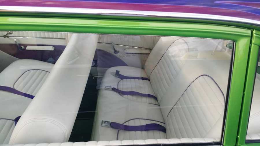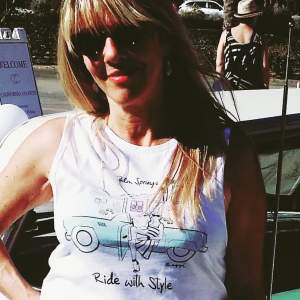 At classic + vintage car show at convention centre. Standing in front of a T-bird. Ride with Style tank (from Just Fabulous – it’s just a fabulous store in Palm Springs. Top made especially for them.