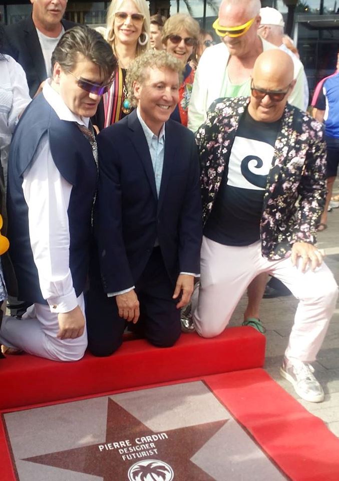 Pierre Cardin’s nephew Rodrigo Basilcati (in white shirt) flew in from Paris to represent his uncle, mayor of Palm Springs, Geoff Kors (in suit), documentarians P. David Ebersole (kneeling) + Todd Hughes (yellow sunglasses) – both self-confessed CARDINaholics. They just can’t help themselves. They’re obsessed! Photo: d. king