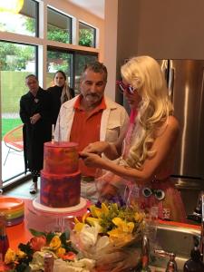 Husband Jerry looks on as Tracy cuts into her exquisite birthday cake from Over the Rainbow desserts. It was Over the Top good. Photo: d. king