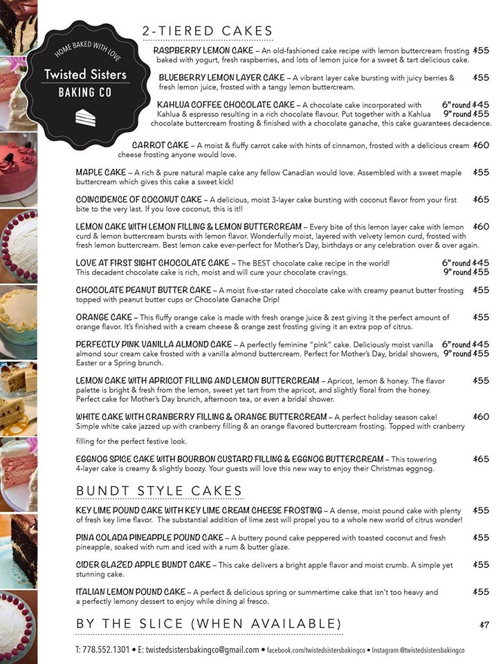 An amazing assortment of two-tiered & bundt-style whole cakes or by the slice (when available – 4 slice minimum). Slices are generous too. They started Twisted Sisters Baking Co. out of a love for baking and when self-isolating during this covid-19 period. See menu at bottom.