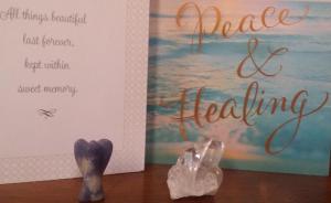 Cards and Stones. An Angel sits next to a clear quartz – the most powerful healing stone of the mineral kingdom.This addition to my mural was completed last summer by Kris Friesen. Photo: d. king