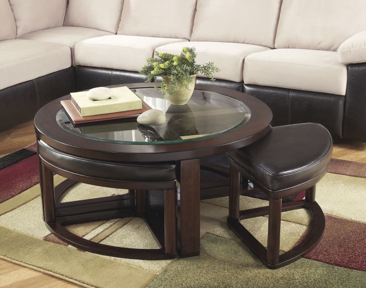 This 5-piece coffee table-slash-stool set may be the coolest. Not only does this multi-tasking table offer up plenty of surface space, it seamlessly holds four faux leather stools inside; for all the extra living room seating you’ll ever need.