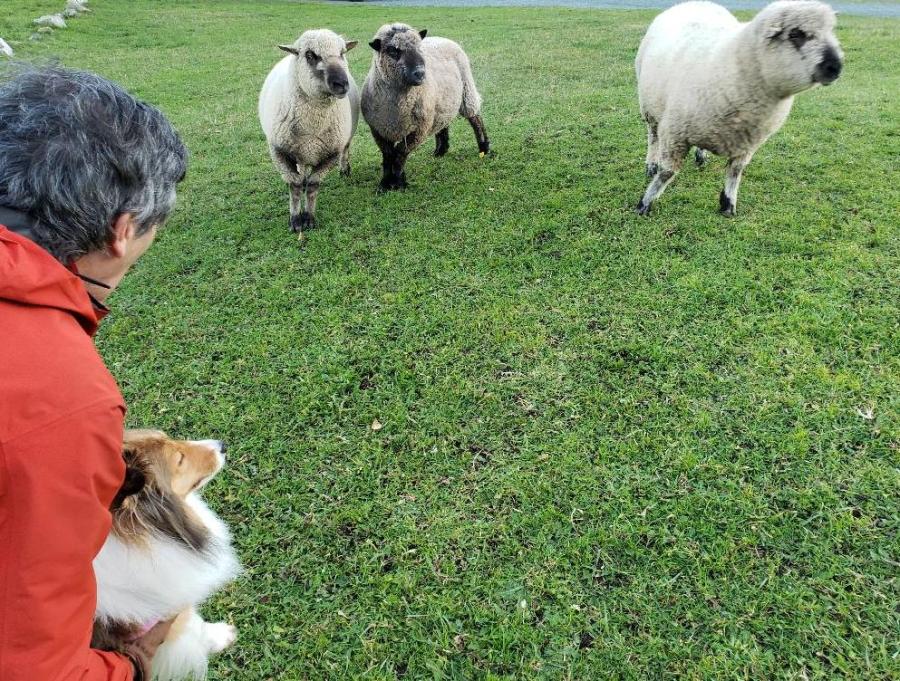 And, as I happened to have one Shetland sheepdog in the hatchback of my car, I thought it a good idea to see how she would respond to the little lambs that were silently grazing behind a fence. Especially since knowing that the breed (sheltie for short) are herding dogs that originated from Scotland’s remote and rugged Shetland Islands. Known to be easy trainers and world-class competitors in obedience, agility, and herding trials, I was dying to find out how she’d react.