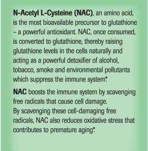 Your body uses NAC as a precursor in making Glutathione, one of the more potent antioxidant nutrients that help quench free radicals thereby preventing oxidative stress in cells.