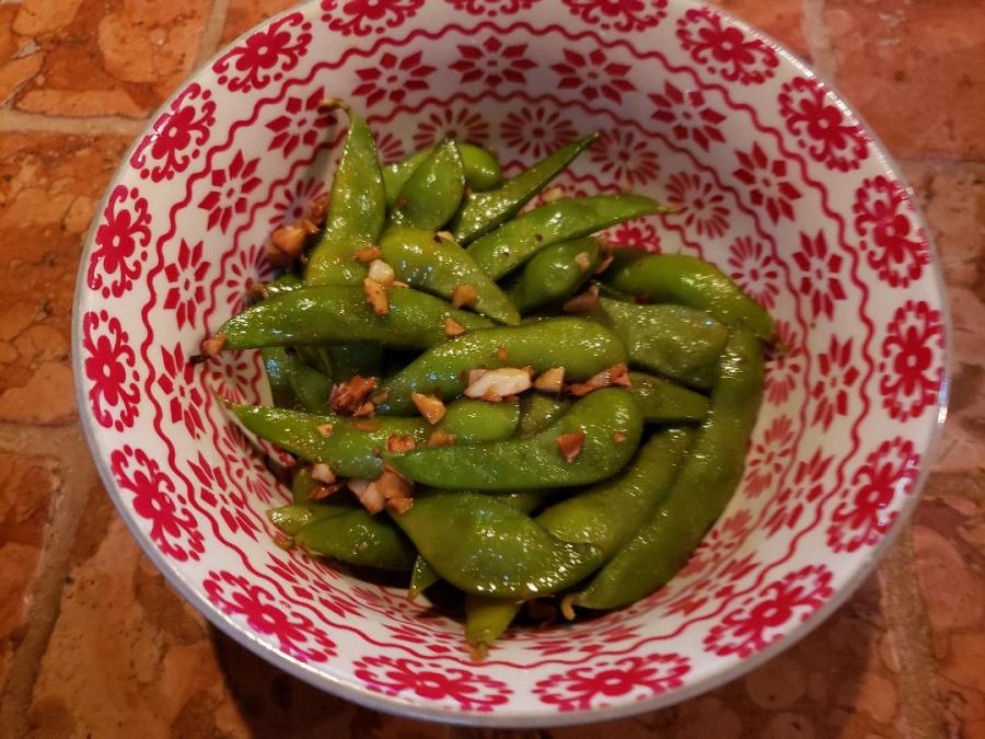 This recipe is a little different because I first steam the pods on their own then sauté them in a mix of toasted sesame oil, fresh chopped garlic + ginger, chili flakes and *soy sauce. Then mix everything together in a bowl and sprinkle generously with course sea salt.