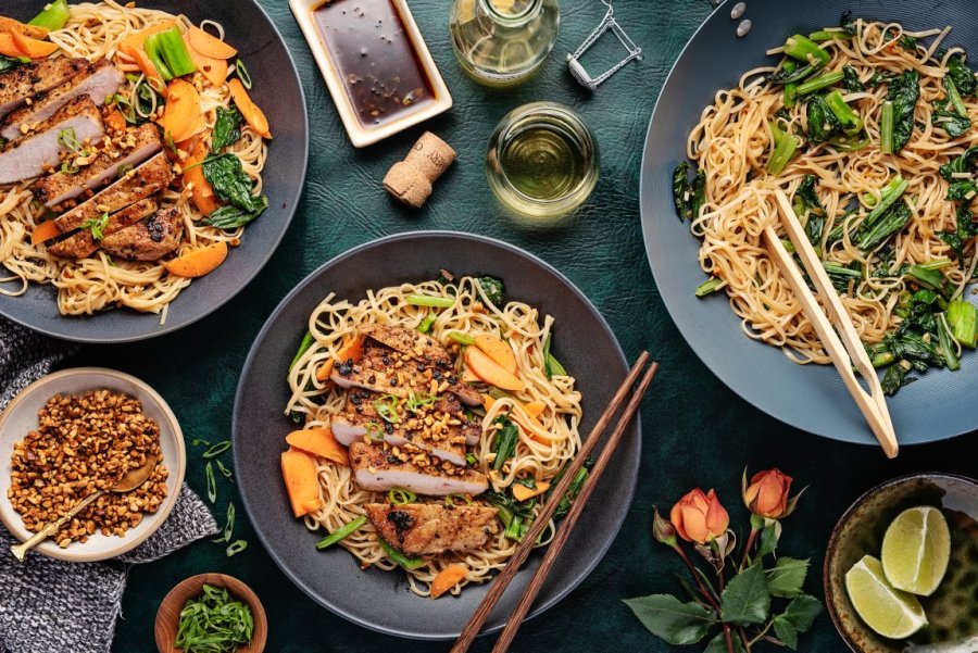 Vietnamese-Style Pork Chop Bún Bowls with Rice Vermicelli, Asian Greens & Toasted Peanuts