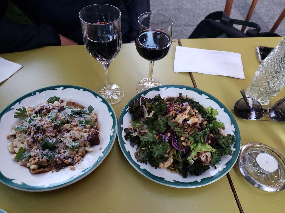 Photo: d. king Autumn Salad with crispy Kale and homemade Spaetzle with local mushrooms. Excellent! Wish I had a bigger appetite for the Rib-Eye and Steelhead.