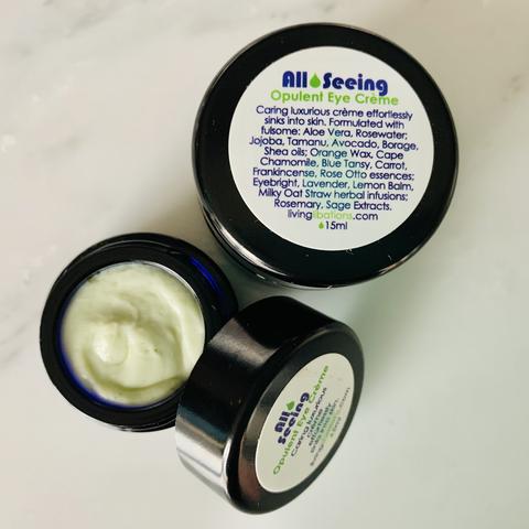 All Seeing Opulent Eye Crème is a thick, rich, luxurious crème that effortlessly sinks into skin and is specially formulated to nourish the tender skin around the eyes. Dry skin, fine lines, and wrinkles will enjoy an influx of moisture with this caring crème.