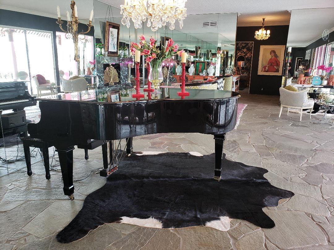 Aside from the original interior design which includes the etched “M’s on the mirrors (that baby Marchesa will one day inherit), Tracy added bold color and contrast, keeping faithful to Hollywood Regency elegance, signifying both opulence and comfort. Something not so easy to achieve. A few of the paintings of beautiful Magda that belonged to Magda, now belong to the Turcos, along with some of the furniture (including piano shown here) which belonged to Zsa Zsa from the Gabor era. A bygone era, or so we thought.